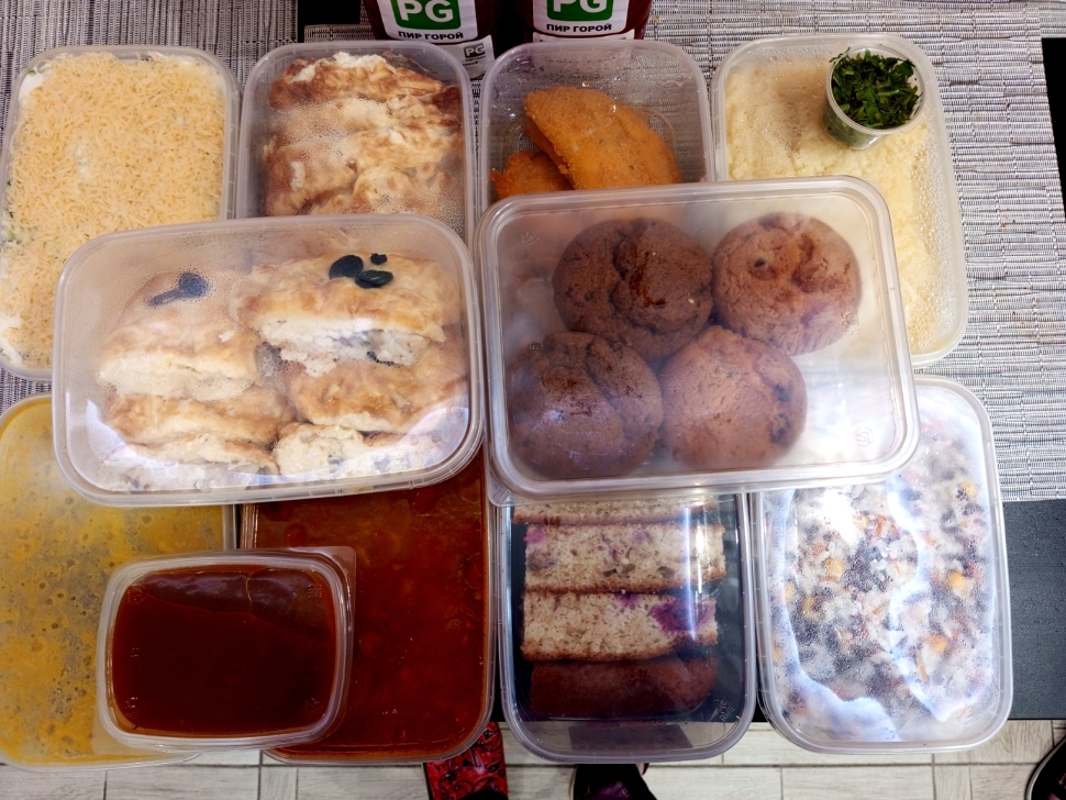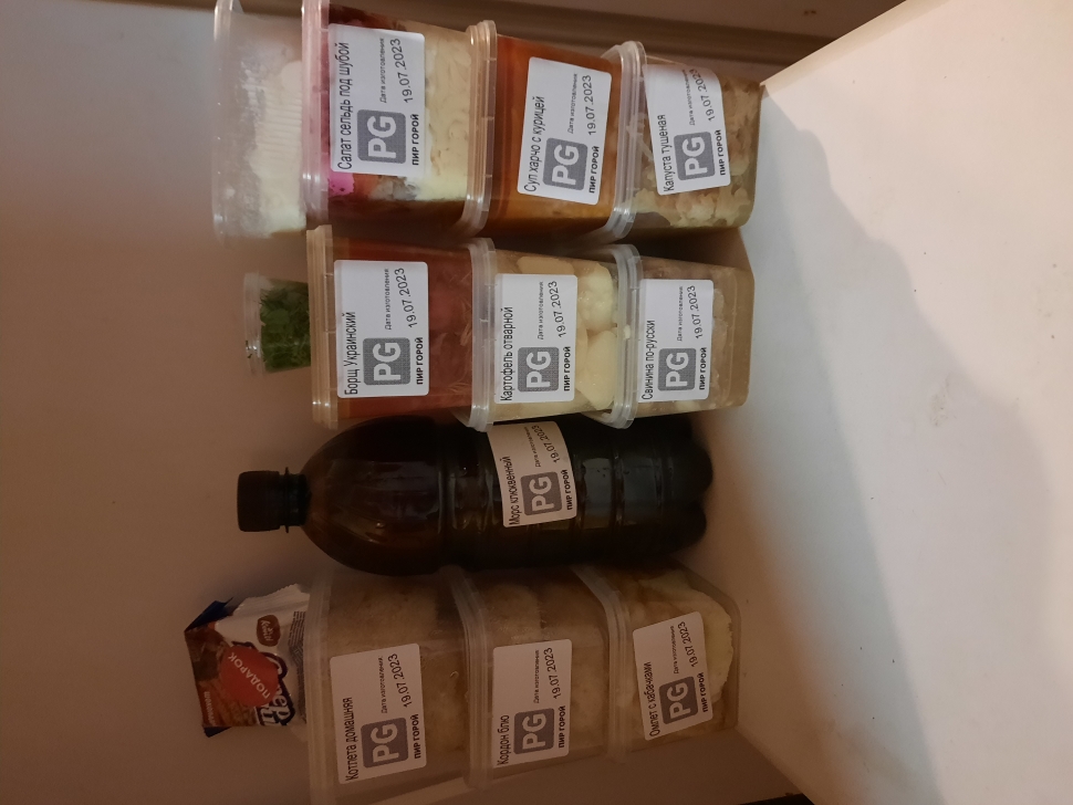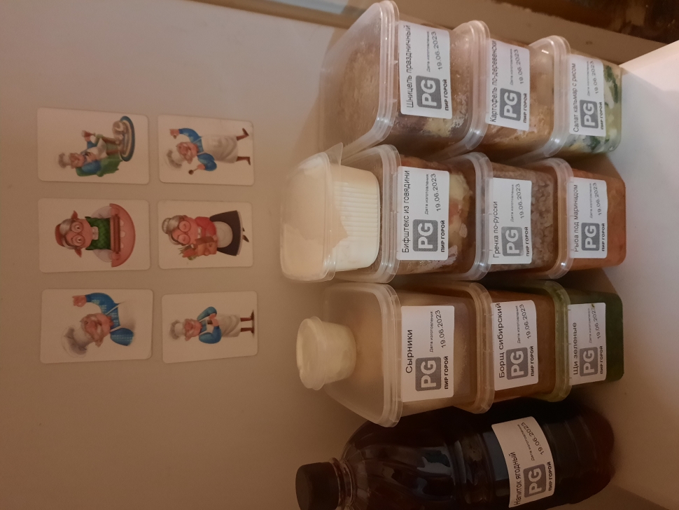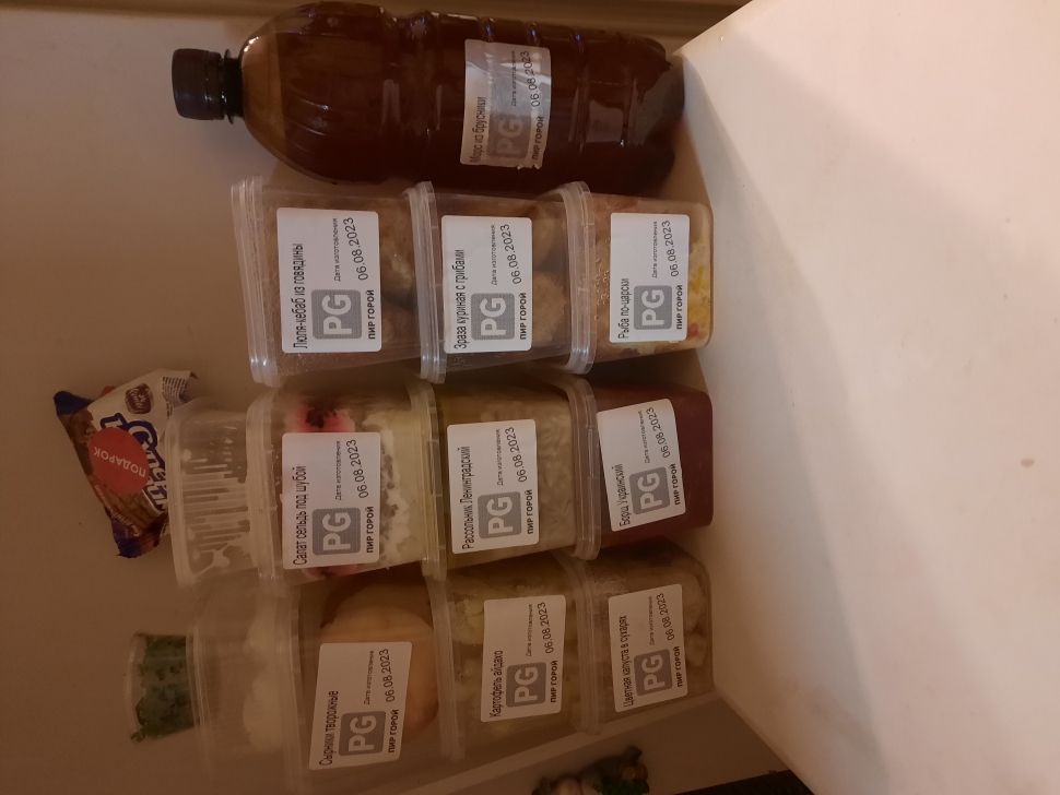 Здравствуйте, в наборе были: 1) оладьи 2) суп фасолевый с колбасками 3) борщ 4) люля-кебаб 5) свинина в кляре 6) жаркое по-домашнему 7) перловка 8) цветная капуста в кляре 9) салат витаминный из капусты из яблок. Больше всего понравился суп фасолевый с колбасками - наваристый, пряный, густой, сытный за счёт фасоли. Другие блюда тоже радовали нас каждый день домашним вкусом. Облегчают ведение быта. Все блюда можно без сомнений брать, только цветная капуста на любителя, я ее дополнительно поджаривала на сильном огне до корочки.